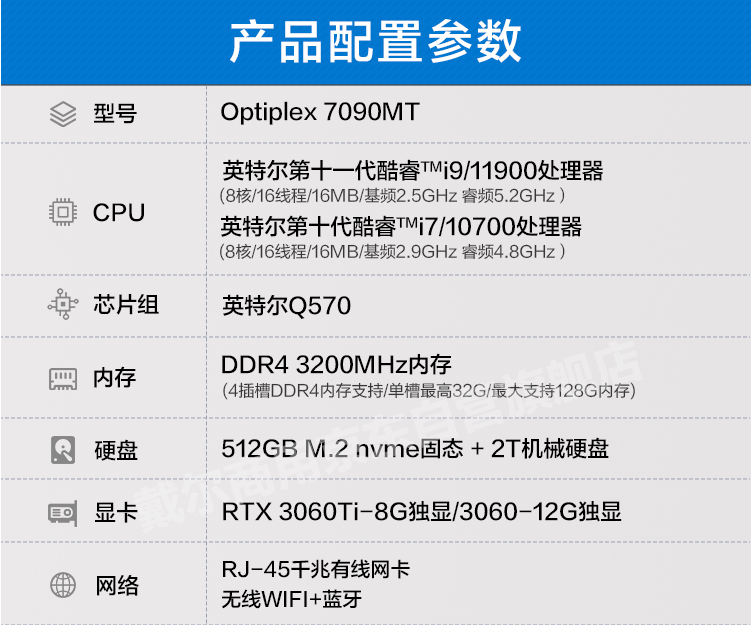 戴爾(DELL) 臺式機7090MT Optiplex高性能電腦主機商用繪圖設(shè)計渲染游戲 定制 i9-11900/32G/512G固態(tài)+2T RTX 3060Ti 8G